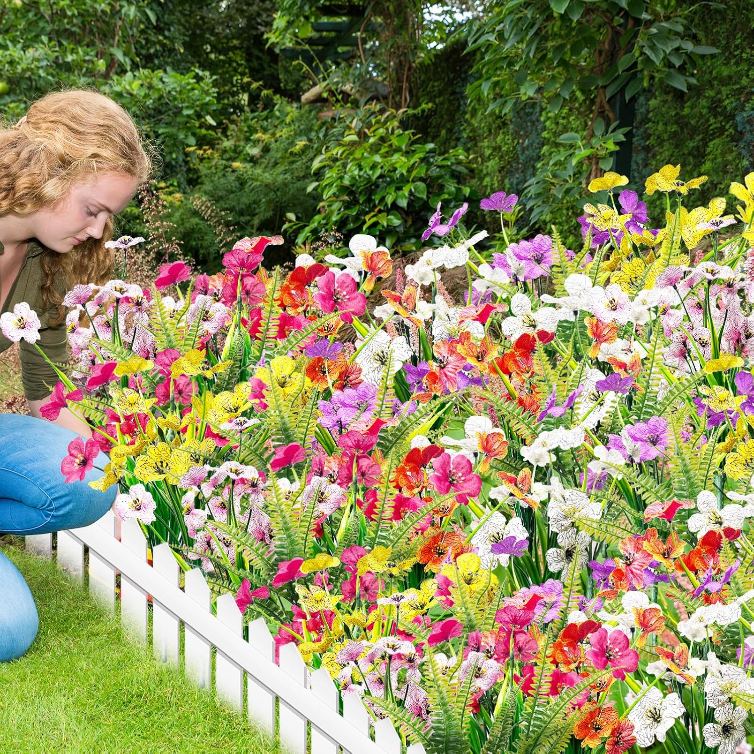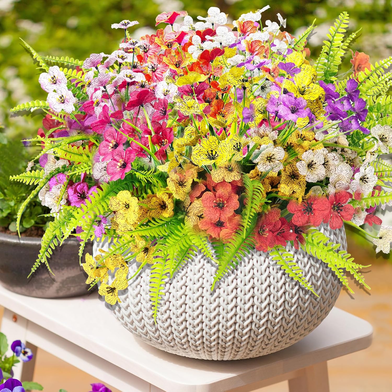 - 【Lifelike Artificial Flowers】: These outside silk plants flowers look quite realistic, bright silk artificial flowers matched with lifelike boston ferns is the ideal choice for your decoration.These plastic fake flowers are mixed and matched with different colors, even if you are busy at work, you can enjoy the blooming flowers all year round.