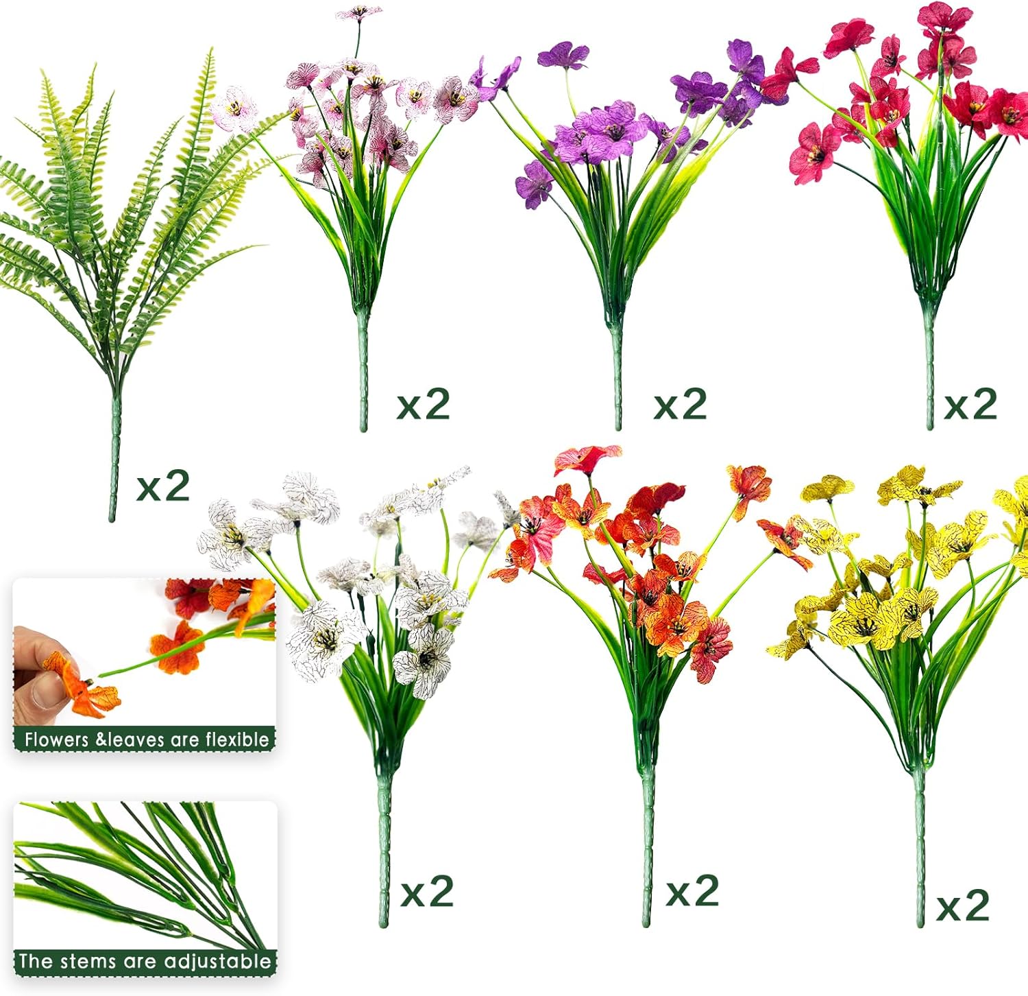 - 【Size&Value Packaging】: Faux flowers size are 13.8in length * 7.5in wide. Each faux flower has seven flexible stems, dense leaves and countless flower heads. You will receive 14 artificial plant flowers, including 12 silk flowers and 2 boston fern, you can invite friends and families to enjoy the afternoon refreshments at the ideal home.
