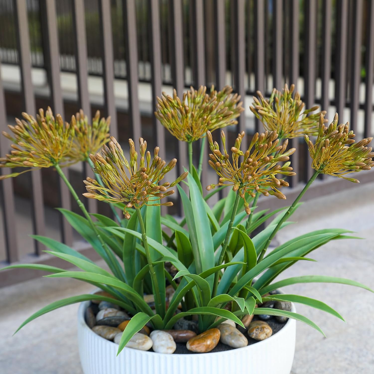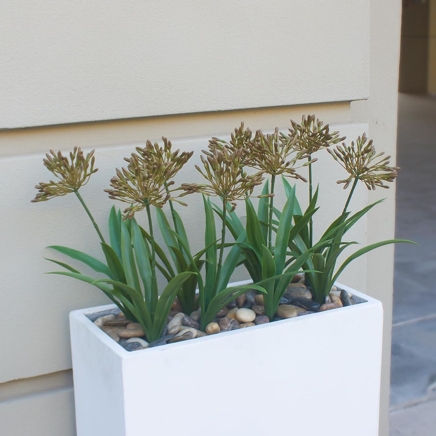 Elevate your outdoor and indoor spaces with these stunning 18.9-inch Artificial Agapanthus Flowers. Designed to surpass the standard 12-15 inch market size, these larger stems feature 5.9-inch flower heads that create a striking, lifelike display. Each set includes 8 bundles, providing a lush and vibrant arrangement perfect for garden planters, front porches, or home interiors. Crafted with artisan-level detail, these faux plants achieve a perfect balance between blooms, leaves, and stems. Each stem is adorned with 7 thickened leaves with irregular edges to replicate natural foliage. The umbrella-like blooms unfold gracefully, offering an elegant form that is virtually indistinguishable from real flowers, while the UV-resistant material ensures long-lasting color even in sunny climates. These low-maintenance flowers are the ideal solution for busy homeowners or those in harsh climates. They require no watering, sunlight, or trimming, yet stay vibrant year-round. Whether used in vases, centerpieces, or outdoor garden beds, their weather-resistant design makes them a versatile choice for any setting. Customers love the quality and durability. One reviewer noted, "Really like these flowers, uv rated for color retention and just the right height. Good value and made well. I live in Florida these are what I was looking for."