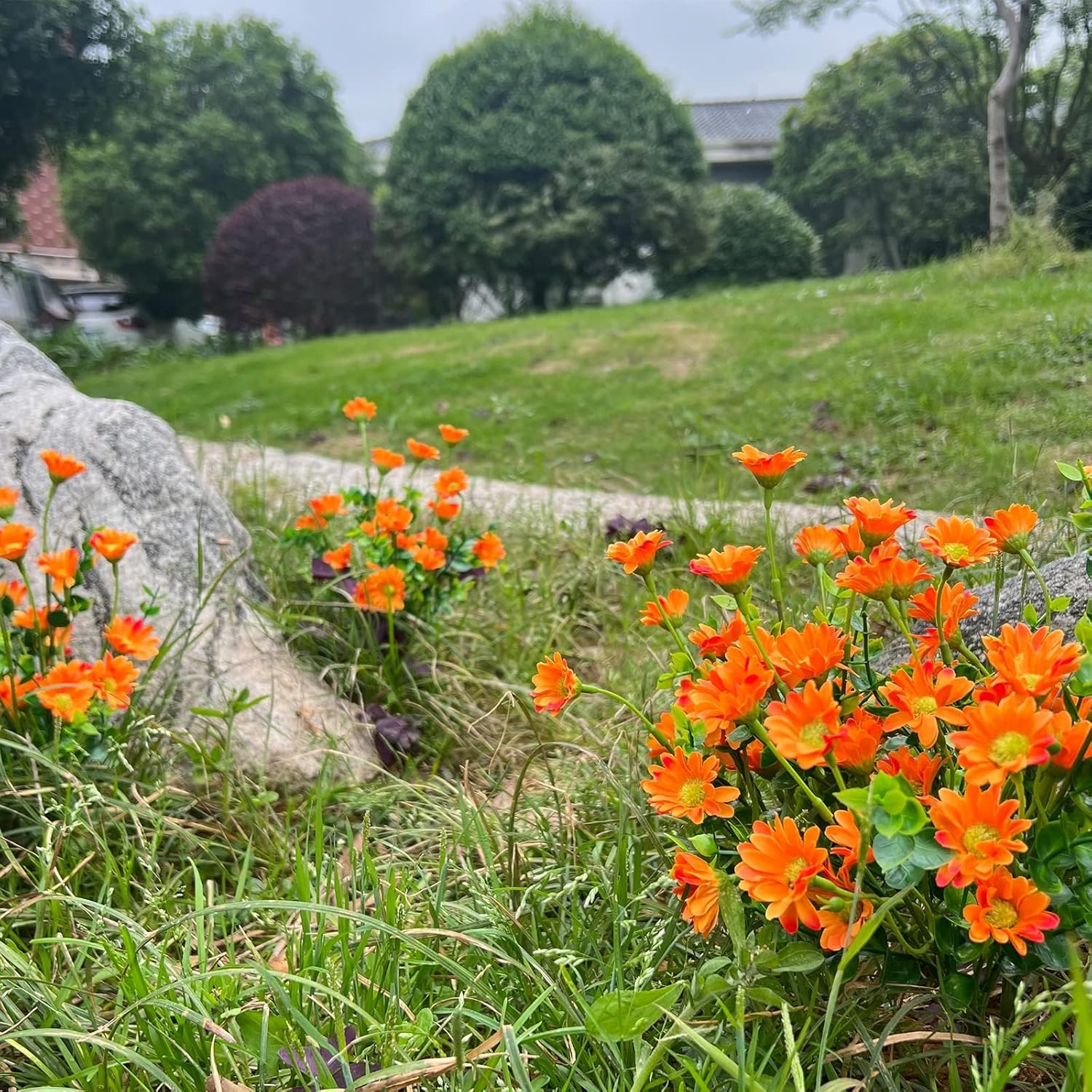 Enhance your home's curb appeal with these vibrant artificial chrysanthemums. This set includes 8 full bundles of lifelike orange daisies, designed to bring lasting beauty to any setting without the maintenance of real plants. Each bundle measures approximately 12.9 inches and features a lush arrangement of stems and blossoms. These flowers boast a realistic design with fuzzy-like flower centers and double-layered petals of varying sizes to mimic natural growth. Crafted from high-quality silk and UV-resistant plastic, they are built to withstand the elements while maintaining their brilliant color and natural appearance in any outdoor or indoor environment. Perfect for front porches, walkways, garden fences, and window boxes. These versatile plants also add a touch of warmth to indoor spaces like kitchens, offices, and dining tables, providing a year-round floral display that never wilts. Customers love the high-quality finish, frequently highlighting the "realistic look and bright colors" that make these faux plants a favorite for home and garden decoration.