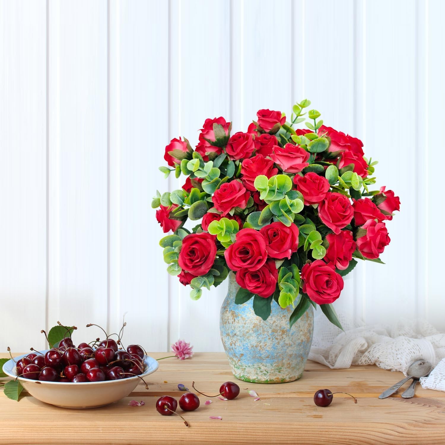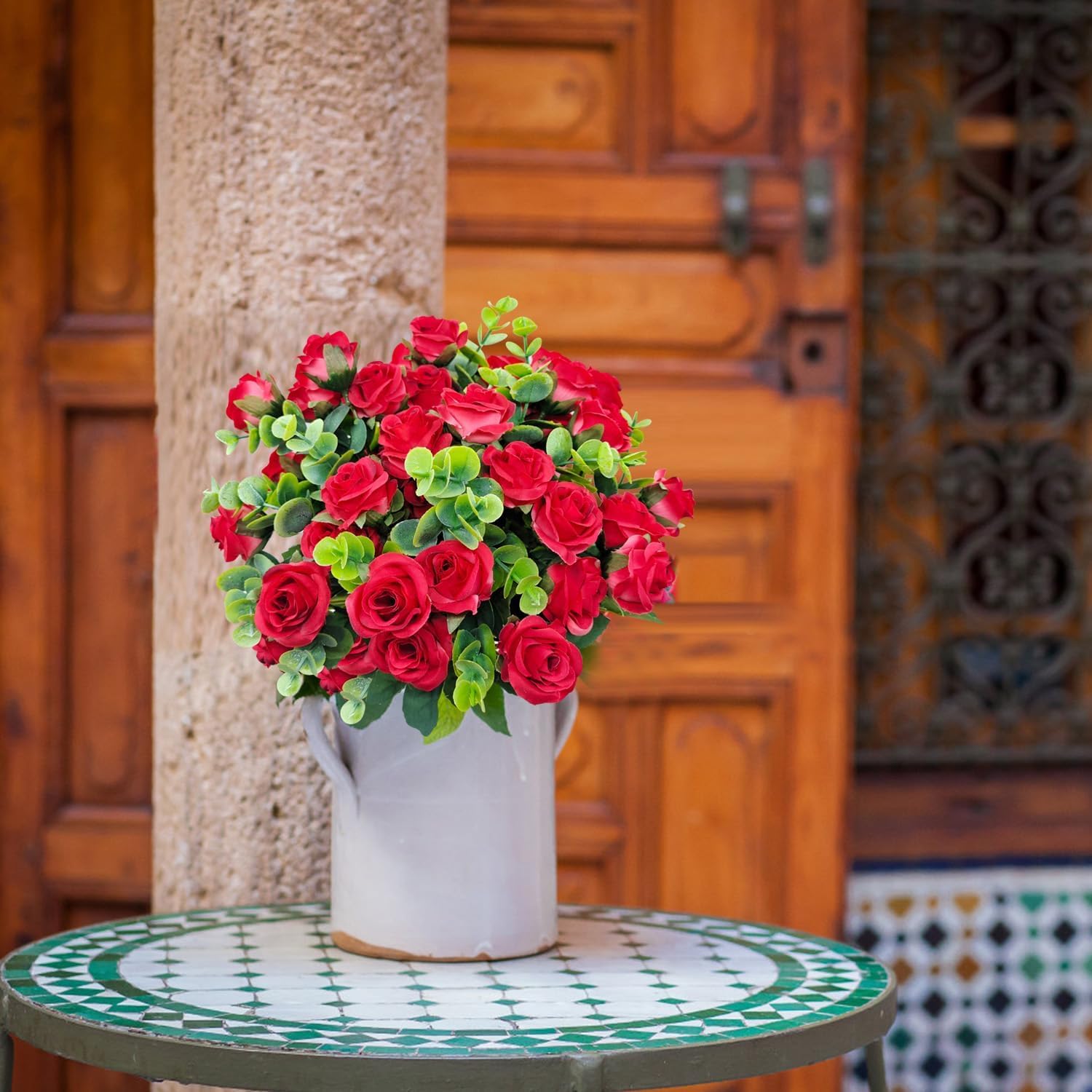 - High-quality silk roses and plastic eucalyptus for a lifelike look.