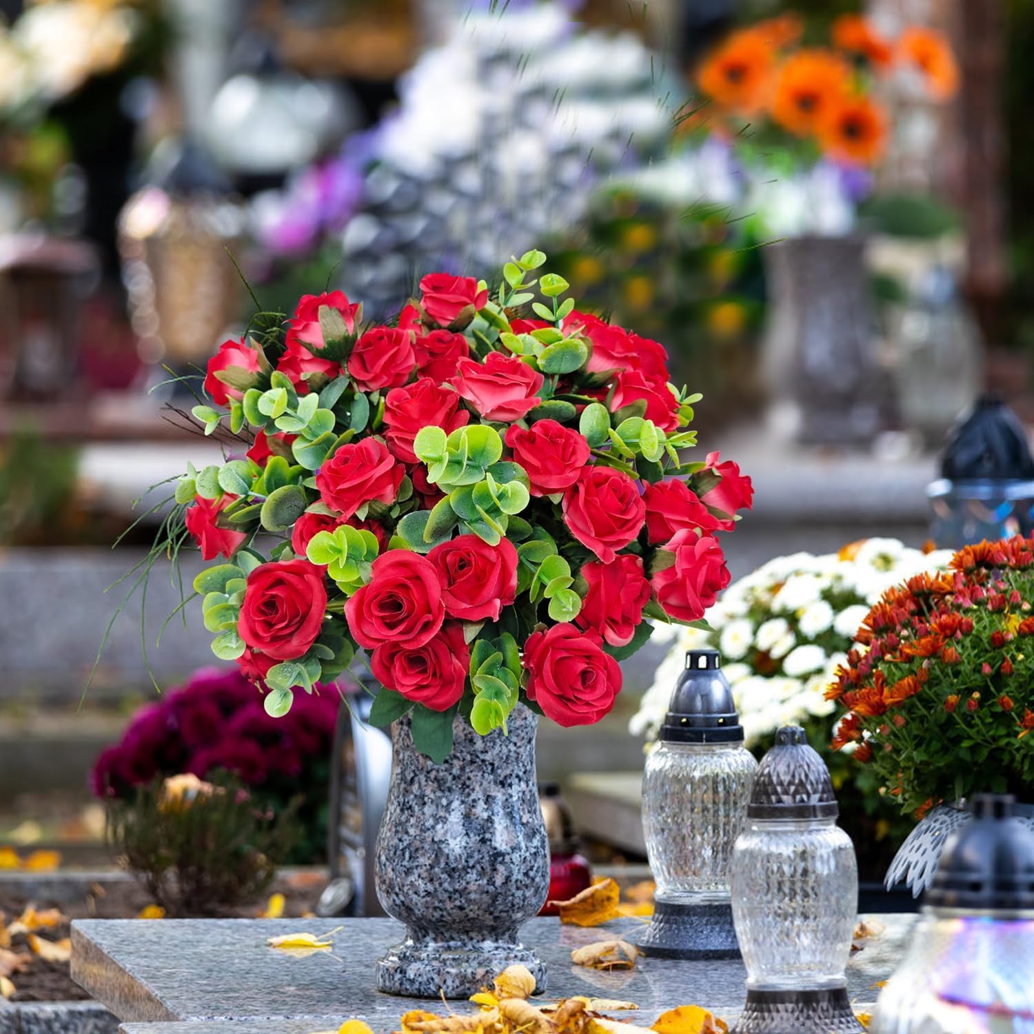 Elevate your space with this stunning 10-piece artificial rose bouquet. Featuring vibrant red silk roses complemented by lush plastic eucalyptus leaves, this arrangement offers a realistic and timeless aesthetic that never fades. Whether you are looking to brighten up your living room or add a touch of elegance to your garden, these faux flowers provide a maintenance-free solution for year-round beauty. Crafted with high-quality materials, these roses are specifically designed for both indoor and outdoor versatility. The UV-resistant coating ensures that the deep red hues remain vivid even under direct sunlight, making them ideal for backyard landscaping, patio accents, or porch displays. Each set includes four bunches, creating a full and lush appearance that mimics the texture of real flora. These versatile bouquets are perfect for a wide range of decorative purposes, from wedding centerpieces and home staging to more personal uses. Their durable construction allows them to withstand various weather conditions, ensuring they stay vibrant regardless of the season. Measuring approximately 13.86 inches in width, they fit perfectly into standard vases and decorative pots. Customers have found these flowers to be exceptionally meaningful and versatile, with one reviewer noting, "Will use these for graves. Very pretty..." This highlights their suitability for memorial sites, cemetery decorations, and other outdoor tributes where long-lasting beauty is essential.