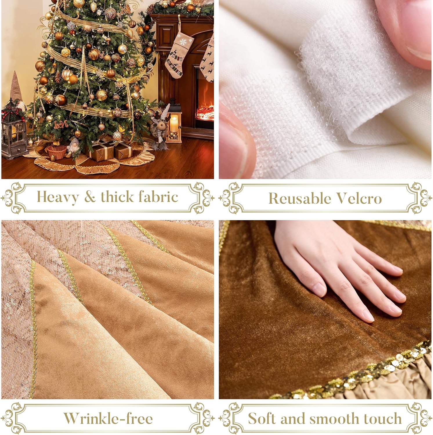 Premium Quality & Craftsmanship Crafted from premium embroidered sequins and textured fabric, this tree skirt features meticulous stitching in multiple layers. The luxurious texture combines excellent breathability with exceptional durability. Professional designers handcraft each piece, carefully selecting fabrics and using skilled techniques for a truly special holiday accessory.