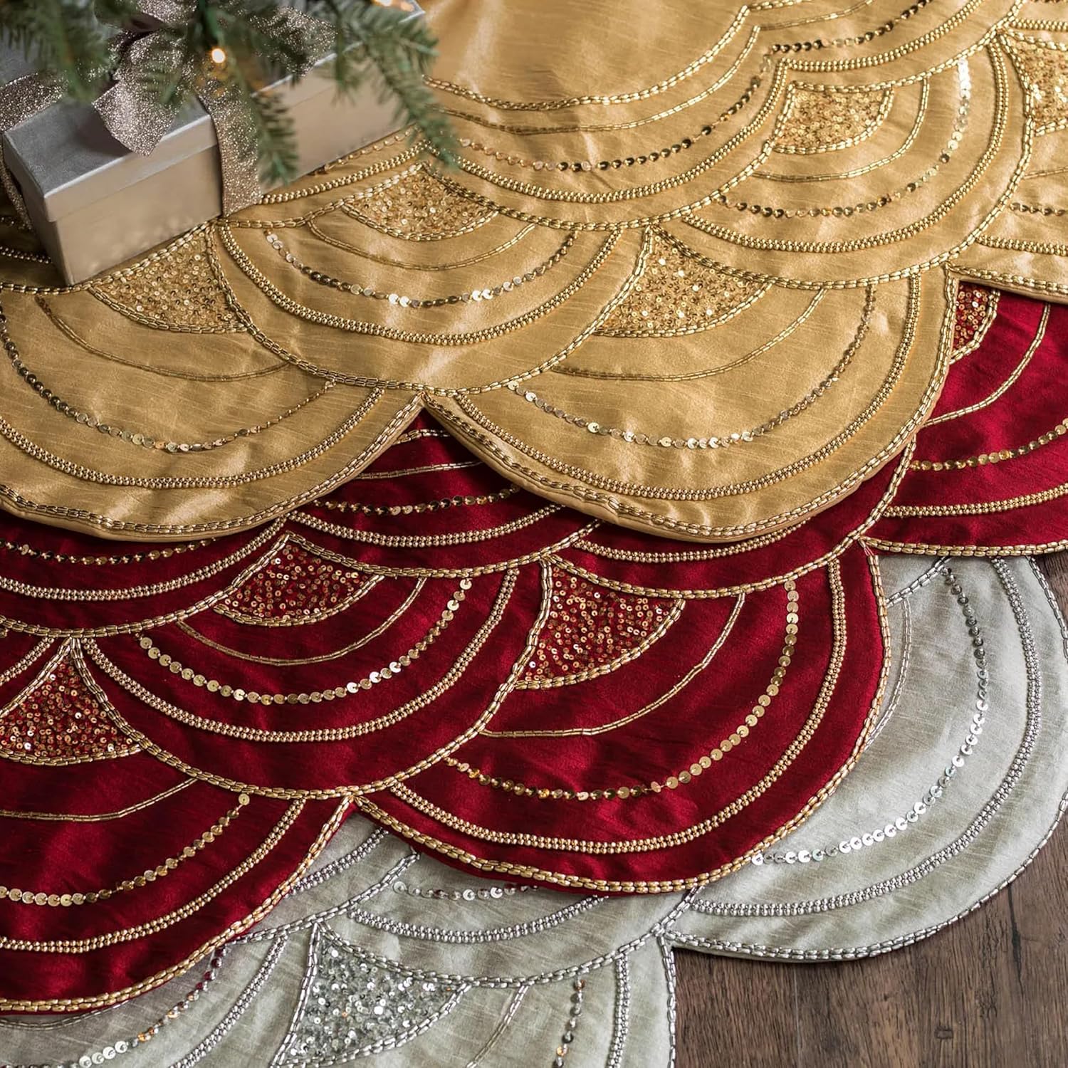 Hand-Applied Embellishments: Scalloped edges are adorned with hand-applied beads and sequins, showcasing exquisite craftsmanship and premium detailing to elevate your tree decor.