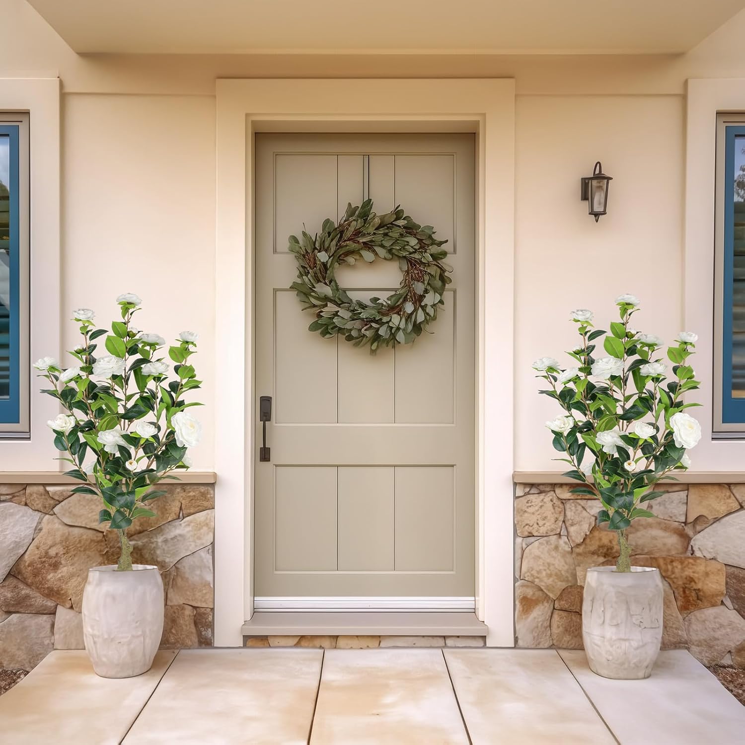 Bring everlasting spring to your space with this 2-pack of 3FT artificial camellia trees. Featuring handcrafted white blooms and lush green foliage, these faux plants deliver nature's beauty without maintenance. The weighted plastic pots ensure stability, while UV-resistant materials preserve vibrant colors in both indoor and sheltered outdoor settings. Each tree showcases premium silk flowers and flexible plastic stems that mimic natural growth patterns. Unlike sparse artificial plants, these camellias boast full, lifelike arrangements that maintain their perfect shape year-round. The 36-inch height creates ideal visual impact for floor placements without overwhelming your space. Perfect for framing entryways, accenting office desks, or enhancing patio planters. Use the pair to create symmetrical elegance beside fireplaces, or separate them to refresh multiple rooms. Their neutral white-and-green palette complements modern farmhouse, traditional, and contemporary decor styles. Customers rave: 'Finally a faux plant that looks real! The fullness and details beat other artificial trees I've tried.' Another notes: 'Perfect desk companion - stays vibrant even with zero sunlight or care.'