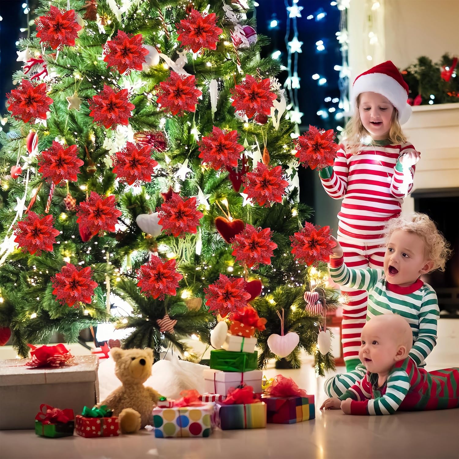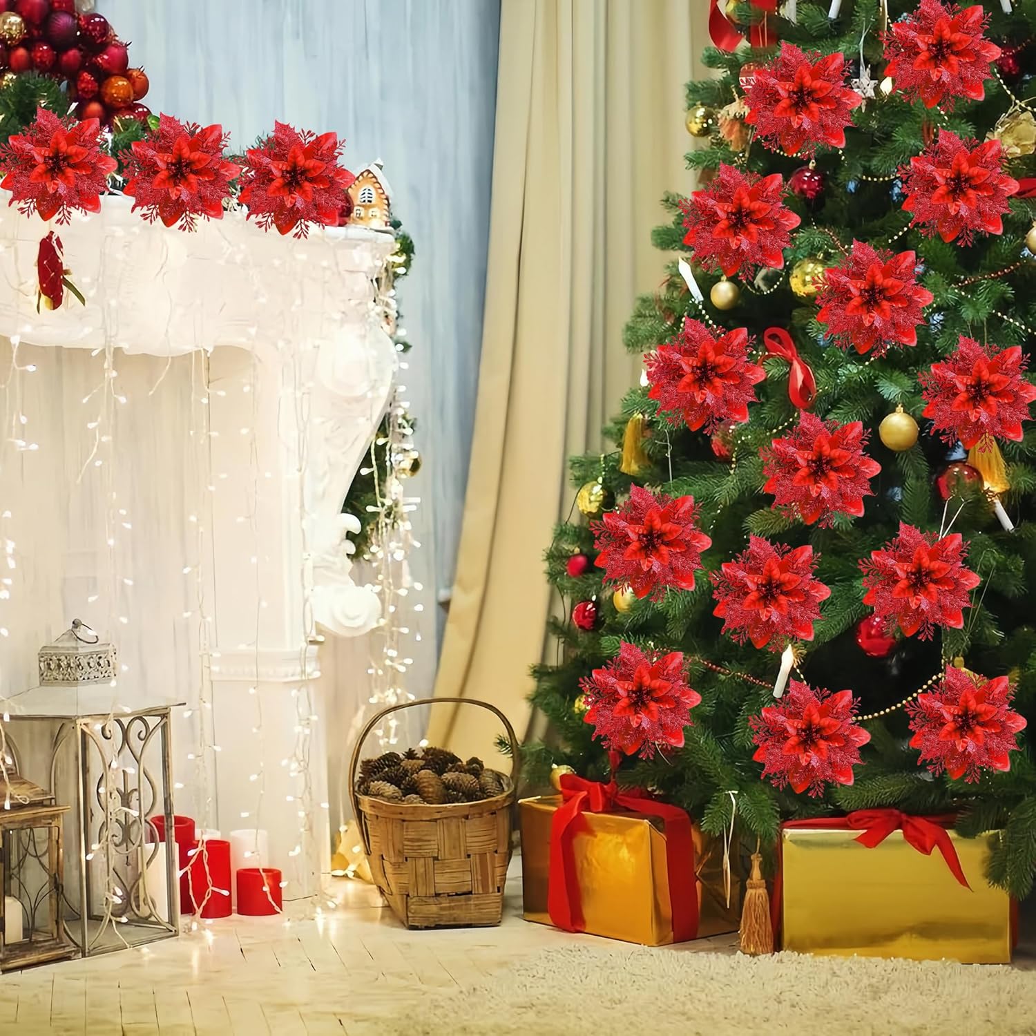 Package Includes: - 20 pcs red glitter poinsettia flowers. - 20 pcs metal clips for easy attachment.