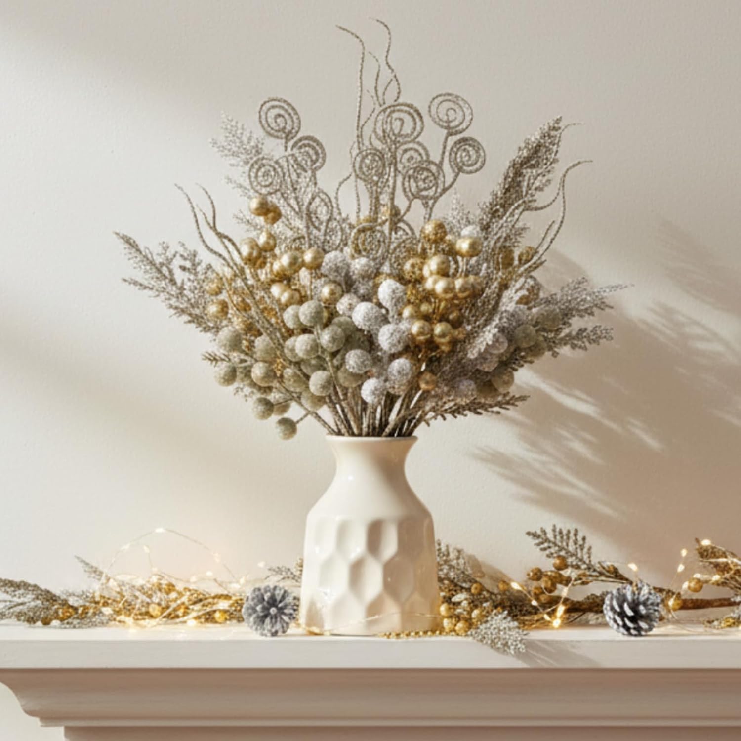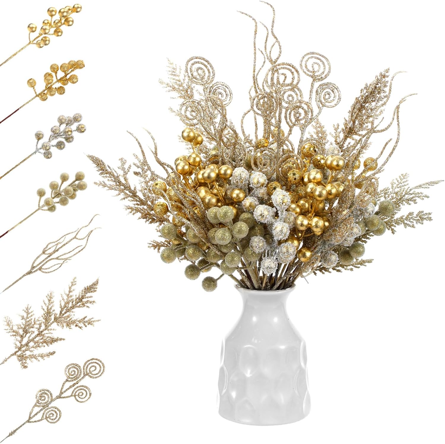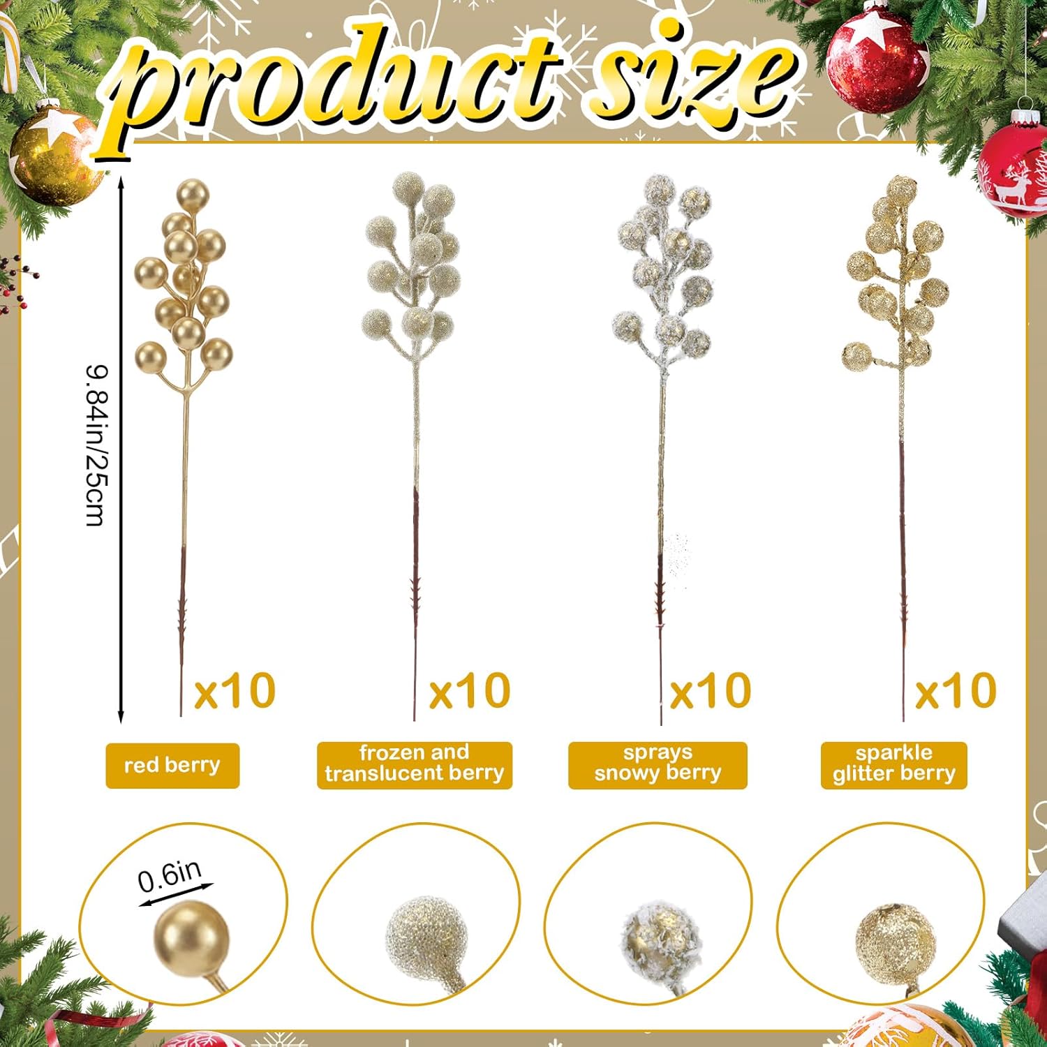 Product Details: This 80-piece champagne gold Christmas decoration set includes 7 styles: - 10 champagne gold berry picks - 10 sparkle glitter berry picks - 10 sprays snowy berry picks - 10 iced and translucent berry picks - 20 artificial pine branches - 10 floral twig sprays - 10 curly stem picks
